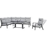 Pripravite svoj vrt na poletje z vrtno lounge garnituro z aluminijastim ogrodjem, ki združuje moderen videz, kakovostne materiale in visoko udobje! Ta izpopolnjena garnitura v Loblikovani postavitvi nudi dovolj prostora za 5 do 6 oseb, zaradi česar je popolna za sproščena druženja, večerne zabave ali prijetne popoldanske klepete na svežem zraku. Aluminijasto ogrodje, ki je odporno proti rjavenju, je dopolnjeno z dekorativno in zračno mrežno napetostjo iz Textilene, ki skupaj z mehkimi blazinami poskrbi za idealno ravnovesje med estetiko in funkcionalnostjo. Za dodatno udobje poskrbijo sedežne in naslonske blazine z mehko polnjenimi prevlekami iz kakovostnega Olefin tkanja, ki se ponaša z dolgotrajno vzdržljivostjo in prijetnim otipom. Videz v barvni kombinaciji antracita in sive poudarja čisto, sodobno silhueto, ki se elegantno zlije z vsakim zunanjim ambientom. Garnitura je montažno prilagodljiva možna zrcalna postavitev, kar pomeni, da se popolnoma prilagodi vašemu prostoru. Ključne prednosti: Trpežno aluminijasto ogrodje, odporno