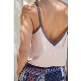 Pink top with thin Blue Shadow strapsFantastic top on thin straps from the Blue Shadow collection. Model with vneckline. Straps and neckline finished with gipurple lace.Composition: 100% viscose