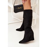 Women's boots made of ecosuede, set on a wedge, combine elegance with comfort. Zippered for easy wear, and the shoe lining ensures warmth in cooler days. The kneehigh shaft gives them a classic look, while the almondshaped toes add subtlety. Ideal for winter styling, these boots pair wonderfully with dresses and skirts. When choosing a size, please refer to the size chart.3624/3724,5/3825/3926/4026,5/4127cm