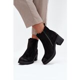 Women's ankle boots made from eco suede. Set on a block heel that provides stability and comfort all day long. Insulated, ensuring warmth on colder days, and a zipper makes them easy to put on. A subtle gold detail on the side of the shaft adds an elegant touch. Perfect for everyday styling that requires both comfort and a fashionable look. Please refer to the size chart when choosing your size. When choosing a size, please refer to the size chart.3623/3723,5/3824,5/3925/4026/4126,5cm