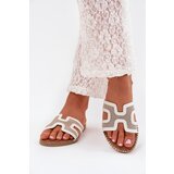 Women's slippers made of a combination of ecoleather and textile material, set on a flat heel, are a comfortable option for everyday wear. There is a golden decoration at the sole that adds a unique character to them. The soft insole provides comfort throughout the day, making the slippers perfect for casual and summer outfits. When choosing a size, please refer to the size chart.3622,5/3723/3823,5/3924,5/4025/4125,5cm