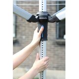 Zunanje vrtno stojalo ima enostavno nastavitev višine od 149 do 190 cm, zato ga lahko enostavno prilagodite svoji višini. V najnižjem položaju je idealen na primer za zračenje blazin in posteljnine. Tristranske vrvice imajo nedrseč profil ter so odporne na upogibanje in UVžarke. Ročaja se zlahka vrtita, tudi če sta popolnoma obremenjena z mokrim perilom, in imata dodatne luknje za obešanje oblačil na obešalnike. Dobro je vedeti: Paket vključuje nosilec za pritrjevanje s premerom 50 cm in pokrov za trdno sidranje v tla, vrečo za obešanje s kavljem in zaščitni pokrov, odporen na vremenske vplive.
