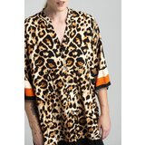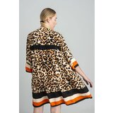 The t tall hit this season are leopard print dresses. If you don't have one in your collection yet, be sure to reach for our new proposal!A leopard print dress is a perfect combination of predatory style and eleganceOur dress, cut off from the hips with a frill, impresses with its original cut and fashionable pattern.Fastened with buttons from the neckline to the hips, with a Vneckline finished with a small standup collar.The kneelength length of the dress makes it perfect for both everyday outings and special occasions. It has comfortable, wide 3/4length sleeves finished with a delicate frill.The bottom of the dress in black, beige and orange stripes contrasts with the bold leopard print pattern, creating a unique effect.If you are looking for a women's dress that will make you stand out from the crowd, a leopard print dress will meet your expectations.Perfect for work, a date or a night out you will always look and feel special in it!One size fits all.ITALIAN PRODUCTIONComposition: 100% viscoseDimensions:Bust circumference 2x61 cmHip circumference 2x71 cmTotal length 91 cmSleeve length measured from the armpit 24 cm