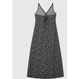 Women's dress in midi length. Plunging neckline. Narrow spaghetti straps. Gathered at the neckline. Slit and patterned.