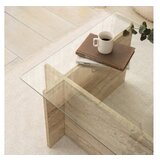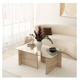 Dvignite slog in prefinjenost vaega bivalnega prostora z nao osupljivo marmornato mizo za kavo. Ta miza, izdelana z zgornjim delom iz 100% stekla in dno 100% melaminske ploe, prevleena z melaminsko prevleko, izareva razkoje in eleganco. Eleganten dizajn v kombinaciji z barvo travertina ustvarja brezasen kos, ki bo brez teav dopolnil kateri koli dekor.