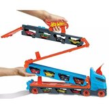 Ogromen poltovornjak omogoča samostojno igranje, hkrati pa služi tudi kot prostor za shranjevanje do 22 vozil (naprodaj ločeno). Igrača 3 v 1 se prav tako spremeni v dolgo dirkališče z dvojnim zaganjalnikom za tekmovalne dirke. Večnamensko vozilo je opremljeno s tremi vozili Hot Wheels v merilu 1:64 in lahko sprejme še 20 (naprodaj ločeno). Otrokom, starim od 4 do 8 let, nudi neskončno zabavo.