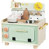 Pripravite se na kulinarično dogodivščino s to leseno kuhinjico, navdihnjeno po tradicionalni babičini kuhinji. Otroci se lahko igrajo male kuharje ter razvijajo svojo ustvarjalnost in fino motoriko. Kuhinjica vključuje vso opremo kot prava kuhinja, priloženih pa je tudi 9 dodatkov, zato je popolna za igro in izmišljanje najrazličnejših receptov! Zdaj je čas, da zavihamo rokave in pripravimo domače krompirjevo pire ali slastne hrustljave piškote! Velikost te kuhinjice je zasnovana tako, da se prilega tudi manjšim igralnim prostorom: meri 41,5 × 25 × 41,5 cm. Primerna je za otroke od 3 let dalje. Funkcije in oprema: pečica z vrtljivimi gumbi in magnetnimi vratci, pomivalno korito z vrtljivimi pipami, kuhalne plošče, držalo za krpo, ura. Pribor (9 kosov): 2 deski za rezanje, ponev, lonec, penovka, zajemalka, solnica, popernica, začimbnica. Kuhinjica je izdelana iz kakovostnega lesa s certifikatom FSC. Prednost so unikatne pečniške pante, odporne na lomljenje in zasnovane za enostavno montažo.