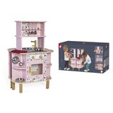 Obojestranska lesena kuhinja za otroke od 3 let starosti s pralnim strojem in drugimi dodatki. Kuhinjo je mogoče odpreti po celotni dolžini, kar vam omogoča veliko več prostora. Kuhinja je opremljena s kovinskim umivalnikom, leseno pipo in indukcijsko kuhalno ploščo z zvokom in svetlobo, pečico, pralnim strojem, vrtljivimi gumbi z zvočnimi učinki in drsnimi vrati. Skupaj s kuhinjo boste dobili tudi druge dodatke – ponev, cedilo, zajemalko, žlico za špagete, obračalko, zajemalko z luknjicami, lonec in rokavico iz blaga. Kuhinja Twist je idealen za igro več otrok hkrati. Na eni strani kuhinjska niša, na drugi pa delovna površina s pralnim strojem. Otrokom daje prostor za domišljijo in izumljanje novih in novih iger. Pametno je opremljena s kovinskim umivalnikom, leseno pipo in indukcijsko kuhalno ploščo z zvokom in svetlobo. Lučke na kuhalnih ploščah se prižgejo s preprostim pritiskom na rdeče gumbe, ob drugem pritisku pa boste zaslišali zvok vrele vode. Zvočni in svetlobni učinki se samodejno izklopijo po 30 sekundah ali po tretjem pritisku na gumb. Pečica in pralni stroj imata vsaka dva vrtljiva gumba z zvočnimi učinki. Vrata pralnega stroja se zapirajo z magnetom in so prozorna, zato lahko preverite, ali je pralni stroj že opral perilo! V omarici z drsnimi vrati lahko shranjujete posodo in hrano. Ob straneh kuhinjske niše sta dve omarici s policami za shranjevanje drugih pripomočkov. Poleg tega imajo otroci na voljo kovinske obešalne kaveljčke za zajemalke in obračalke. Za zagotovitev varnosti je kuhinja opremljena z elastičnim trakom, ki je idealen tudi za prenašanje. Kuhinja je opremljena tudi z blazinicami iz filca za noge za zaščito tal. Igra s kuhinjo razvija igro vlog, fino motoriko in ustvarjalnost (na primer pri izmišljanju novih receptov). Dimenzije kuhinje so 55,6 x 47,2 x 87,5 cm. Višina delovne plošče je 50,3 cm.