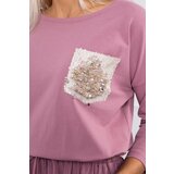 We present you a fashionable dress with a pocket. Pocket covered with sequins. The dress has a tie at the waist. Great suggestion for all ladies. The dress is made of high quality material. The size is universal and will be suitable for ladies in sizes S M or L.Material composition:90% cotton10% ElastaneDimensions:Chest width: 48 cmOverall length: 91 cmSleeve length from armpit: 28 cmWaist width: 28 cm / stretched: 47 cm