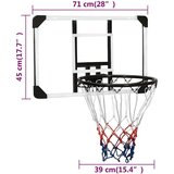 S to košarkarsko tablo lahko vadite streljanje na koš ali izzovete prijatelje na igro! Trpežen material: Košarkaška tabla je izdelana iz polikarbonata, zato je zelo trpežna in močna, odporna na vremenske vplive in enostavna za čiščenje. Klasičen jeklen košarkarski obroč z najlonsko mrežo za vse vremenske razmere prav tako zagotavlja dolgo življenjsko dobo košarkarskega obroča.Zasnova za namestitev na steno: Uporablja se lahko kot zamenjava za košarkarsko stojalo ali pa se samo pritrdi na steno.Široka uporaba: Ta košarkarska tabla je popolna za igro v zaprtih prostorih in na prostem. Odlično se lahko zabavajo tako odrasli kot otroci. Opomba:Vsakemu izdelku je priložen priročnik za enostavno sestavljanje.Barva: Prozorna, bela, črna, rdeča, modraMaterial: Polikarbonat, jeklo, najlonDimenzije table: 71 x 45 cm (D x Š )Debelina table: 2,5 cmPremer obroča : 39 cmMontažni material je vključen