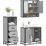 Ta stilski komplet kopalniškega pohištva je odličen dodatek vaši kopalnici, saj ji daje urejen in osupljiv videz! Stabilen in trpežen material: Inženirski les je trpežen in stabilen material z gladko površino, ki je odporen na vlago, krivljenje in cepljenje, zato je zanesljiva izbira za različne projekte.Stabilen in dolgotrajen okvir: Kovinski okvir kopalniške toaletne omarice izboljša vašo notranjost z industrijskim slogom ter zagotavlja izjemno vzdržljivost, stabilnost in odpornost proti koroziji.Veliko prostora za shranjevanje: Kopalniška omarica nudi dovolj prostora za shranjevanje osnovnih toaletnih potrebščin in kopalnih pripomočkov, kot so mila, šampon, zobna pasta itd.Jasna slika: Stekleno zrcalo zagotavlja natančen in nepopačen odsev, zato je primerno za ličenje, britje ali ogled oblačil pred odhodom.Enostavno vzdrževanje: Zaradi gladke površine je kopalniško omarico enostavno očistiti z vlažno krpo, saj ne potrebuje veliko vzdrževanja. Dobro je vedeti:Vijaki in čepi za notranjost stene niso priloženi. Svetujemo vam, da poiščete in uporabite vijake in zatiče, ki so primerni za vaše stene. Če niste prepričani, se lahko posvetujete s strokovnjakom. Preberite in upoštevajte vse korake v navodilih. Opozorilo:Za preprečitev prevračanja je treba ta izdelek uporabiti s priloženo napravo za pritrditev na steno.Barva: Siva sonomaMaterial: Inženirski les, kovina, stekloDimenzije omarice z ogledalom v kopalnici: 65 x 20 x 60 cm (Š x G x V)Dimenzije kopalniške omarice za umivalnik: 65 x 33 x 60 cm (Š x G x V)Dimenzije kopalniške omarice: 35 x 37,5 x 100 cm (Š x G x V)Maks. nosilnost (skupaj): 60 kgPotrebno sestavljanje: DaPaket vsebuje:1 x Kopalniška omarica z ogledalom1 x Kopalniška omarica za umivalnik1 x Kopalniška omarica