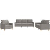 Ta sedežna garnitura je odlična za klepet, branje, gledanje televizije ali samo sprostitev. Postala bo osrednja točka vašega doma. Trpežno blago: Tkanina je preprostega in čistega videza, hkrati pa diha in ima dolgo življenjsko dobo.Trden in stabilen okvir: Vezan les in kovinski okvir oblazinjenega sedišča zagotavljata trdnost in stabilnost.Udobno sedenje: Kavč je zelo udoben z debelo oblazinjenim sedežem, nasloni za roke in hrbtno blazino.Privlačen dizajn: Ta sedišče za dnevno sobo s preprostim, a modernim dizajnom bo privlačen dodatek za vaš prostor.Barva: TaupeMaterial: Blago (100 % poliester), kovina, textillene, vezan lesMaterial polnila: PenaFotelj:Celotne dimenzije: 78 x 77 x 80 cm (Š x G x V)Širina sedeža: 60 cmGlobina sedeža: 50 cmVišina sedeža od tal: 41 cmVišina naslonjala za roke od tal: 56,5 cmKavč dvosed:Celotne dimenzije: 138 x 77 x 80 cm (Š x G x V)Širina sedeža: 120 cmKavč trosed:Celotne dimenzije: 198 x 77 x 80 cm (Š x G x V)Širina sedeža: 180 cmPotrebno sestavljanje: DaPaket vsebuje:1 x Fotelj1 x Kavč dvosed1 x Kavč trosed6 x Blazina Maksimalna teža na sedež: 110 kg. Bodite pozorni na tveganje odprtega ognja in druge vire močne toplote v bližini izdelka.
