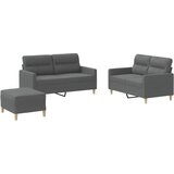 Ta sedežna garnitura je odlična za klepet, branje, gledanje televizije ali samo sprostitev. Postala bo osrednja točka vašega doma. Trpežno blago: Tkanina je preprostega in čistega videza, hkrati pa diha in ima dolgo življenjsko dobo.Trden in stabilen okvir: Vezan les in kovinski okvir oblazinjenega sedišča zagotavljata trdnost in stabilnost.Udobno sedenje: Kavč je zelo udoben z debelo oblazinjenim sedežem in nasloni za roke.Vsestranski stolček za noge: Stolček za noge lahko uporabljate za počitek vaših nog, medtem ko ležite na kavču ali naslanjaču, ali pa kot dodaten sedež v sobi. Poleg tega je zaradi preproste zasnove in kompaktne velikosti idealen za skoraj vsak bivalni prostor.Barva: Temno sivaMaterial: Blago (100 % poliester), kovina, textilene, vezan lesMaterial polnila: PenaDvosed (majhen):Celotne dimenzije: 138 x 77 x 80 cm (Š x G x V)Širina sedeža: 120 cmGlobina sedeža: 50 cmVišina sedeža od tal: 41 cmVišina naslonjala za roke od tal: 56,5 cmDvosed (velik):Celotne dimenzije: 158 x 77 x 80 cm (Š x G x V)Širina sedeža: 140 cmStolček za noge:Celotne dimenzije: 70 x 55 x 41 cm (Š x G x V)Potrebno sestavljanje: DaPaket vsebuje:2 x Kavč dvosed1 x Stolček za noge4 x Blazina Maksimalna teža na sedež: 110 kg. Bodite pozorni na tveganje odprtega ognja in druge vire močne toplote v bližini izdelka.