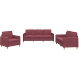 Ta sedežna garnitura je odlična za klepet, branje, gledanje televizije ali samo sprostitev. Postala bo osrednja točka vašega doma. Trpežno blago: Tkanina je preprostega in čistega videza, hkrati pa diha in ima dolgo življenjsko dobo.Trden in stabilen okvir: Vezan les in kovinski okvir oblazinjenega sedišča zagotavljata trdnost in stabilnost.Udobno sedenje: Kavč je zelo udoben z debelo oblazinjenim sedežem, nasloni za roke in hrbtnimi blazinami.Barva: Vinsko rdečaMaterial: Blago (100 % poliester), kovina, textilene, vezan lesMaterial polnila: PenaFotelj:Celotne dimenzije: 78 x 77 x 80 cm (Š x G x V)Širina sedeža: 60 cmGlobina sedeža: 50 cmKavč dvosed:Celotne dimenzije: 138 x 77 x 80 cm (Š x G x V)Širina sedeža: 120 cmGlobina sedeža: 50 cmKavč trosed:Celotne dimenzije: 198 x 77 x 80 cm (Š x G x V)Širina sedeža: 180 cmGlobina sedeža: 50 cmVišina sedeža od tal: 41 cmVišina naslonjal za roke, merjena od tal: 60 cmPotrebno sestavljanje: DaPaket vsebuje:1 x Fotelj1 x Kavč dvosed1 x Kavč trosed6 x Blazina Maksimalna teža na sedež: 110 kg. Bodite pozorni na tveganje odprtega ognja in druge vire močne toplote v bližini izdelka.