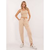The model is wearing one size. Model's measurements: height 175 cm, bust 90 cm, waist 66 cm, hips 94 cm. Dimensions of the set in one size measured flat: width of the sweatshirt under the armpits 60 cm, length of the sweatshirt 81 cm, sleeve length 60 cm, width of the top under the armpits 38 cm, length of the top 42 cm, width of the pants at the waist 34 cm, length of the pants 96 cm.