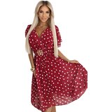 Burgundy polka dot dress with wrap neckline Marilyn style Numoco BasicBurgundy dress with white polka dots in Marilyn Monroe style is the quintessence of femininity and timeless elegance. Made from light, flowing material, it beautifully drapes in movement, creating a sensual and romantic silhouette. The wrap neckline subtly accentuates the bust, while the elastic waist with decorative belt highlights feminine curves.The flared cut will work perfectly for summer outings, romantic walks, dates, garden parties or weddings. This dress by Numoco Basic, produced in Europe, combines retro style with modern wearing comfort. Retro style inspired by Marilyn Monroe Polka dots trendy and timeless pattern Flared cut and light material Wrap neckline and decorative waist belt Numoco Basic brand European productionSensual burgundy dress with white polka dots, envelope cut and flared style. Perfect for summer light, feminine and full of retro charm. Brand Numoco Basic. European production.Measurements are taken flat first measurement is before, second after stretching the material (+/ 2 cm)Model in the photo is 165cm tall and wearing size UNI (S XXL)Measurements:UNIArmpit to armpit (A)42 62Waist (B)30 60Hips (C)42 75Length from armpit (D)76Length from shoulder (E)104