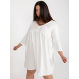 Ecru cotton plus size dress with pockets. Product code: RVSK8529.37PDominant pattern: plainStyle: Casualoccasion: everyday, for the city, for a walk The model is wearing one size. Model's measurements: height 167 cm, bust 102 cm, waist 81 cm, hips 113 cm. Measurements of the dress in one size measured flat: armpit width 60 cm, sleeve length 40 cm, total length 90 cm.