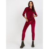 Burgundy twopiece velour set with trousers. Product code: RVKMPL8286.40Dominant pattern: plainStyle: Casualoccasion: everyday, for a walk, for work, for the city The model is wearing a size S/M. Model's measurements: height 175 cm, bust 84 cm, waist 61 cm, hips 91 cm. Dimensions of the set in size S/M measured flat: armpit width 57 cm, sweatshirt length 60 cm, sleeve length 45 cm, waist width 36 cm, waist height 26 cm, pants length 97 cm.