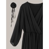 Elegant, timeless women's kneelength dress, featuring a wrap neckline and an elastic waistband. The dress has long sleeves made of mesh and a decorative additional tie with a flower. A great choice for the evening!
