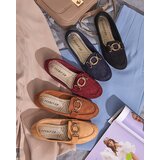 Classic women's loafers with a metal decoration on the toe. The upper is made of ecological chamois leather. The cushioned insole is made of fabric. Perfect for a narrow foot.