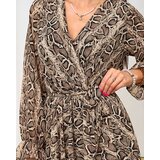 Unique women's long dress made of light, airy material. The model with an envelope neckline and long sleeves has an elastic waistband and an asymmetrical hem. In addition, a fabric belt in matching color.