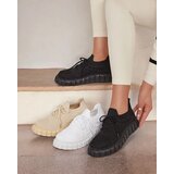 Women's sports shoes on a small platform. Laceup upper, made of fabric. Solidly made and very comfortable thanks to soft rubber sole.