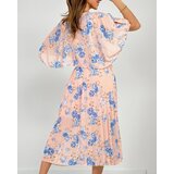 A unique women's dress made of lightweight fabric with a floral pattern. At the height of the waist it has an elastic band. The product is midi length, has short sleeves and pleated trim. Feel the summer in this model!