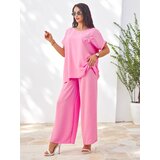 The women's set with short sleeves adorned with a floral motif and wide pants is a combination of comfort and elegance. Ideal for summer days, it provides freedom of movement and a stylish appearance.