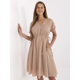 RUE PARIS Beige flared dress. Material: 100% polyesterwashing method: machine wash at 30C The model is wearing a size S. Model's measurements: height 175 cm, bust 84 cm, waist 65 cm, hips 92 cm. Measurements of the dress in size S measured flat: width under the armpits 53 cm, total length 103 cm