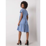 RUE PARIS Blue women's dress with a ruffle. Material: 95% polyester, 5% elastanewashing method: hand wash at 30CThe model is wearing a size S. Model's measurements: height 162 cm, bust 80 cm, waist 63 cm, hips 80 cm. Measurements of the dress in size S measured flat: width under the armpits 44 cm, total length 91 cm