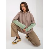 Dark beige women's basic hoodie RUE PARIS . Material: 90% cotton, 10% elastanewashing method: machine wash at 30C Product code: RVBL8232.27XDominant pattern: no patternStyle: casual, sweatshirtoccasion: casual, for work, for school The model is wearing a size S/M. Model's measurements: height 172 cm, bust 88 cm, waist 63 cm, hips 92 cm. Dimensions of the sweatshirt in size S/M measured flat: armpit width 59 cm, total length 74 cm, sleeve length 55 cm.