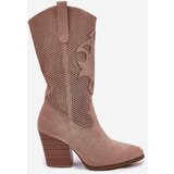 Womens cowboy boots from the brand S.Barski. Made of eco suede, they combine elegance with an original style. The perforated shaft adds lightness and character. Almondshaped toes. Zipper closure. The shaft reaches halfway up the calf. You can use these stylish boots for casual and boho outfits. When choosing a size, please refer to the size chart.