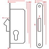 Tehnični podatki Mere: I: 39, Š: 22, V: 20, N: 3, J: 20,5, D: 100,7, M: 136, G: 156, C: 20, O: 10, U: 11,8, Š: 78, X: 144,9, T: 8, S: 33/43. Globina: 35 mm Višina: 115 mm Set vključuje: Ključavnica x1 Kavelj x1 Vijaki x5 Sprememba strani levo/desno: univerzalno