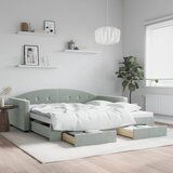Izvlečna dnevna postelja s predali svetlo siva 100x200 cm žametTa 2 v 1 izvlečna dnevna postelja s predali, ki služi kot kavč in postelja, je praktičen in privlačen dodatek za vašo dnevno sobo ali spalnico. Vsestranska dnevna postelja: Raztegljiva postelja čez dan deluje kot kavč, ponoči pa se z izvlečenim ležiščem zlahka spremeni v zakonsko posteljo, kar je priročna rešitev za sprejemanje gostov in maksimalno povečanje prostora.Veliko prostora za shranjevanje: Ta postelja za goste ima dva predala s kolesi, ki zagotavljata dovolj prostora za shranjevanje oblačil, nogavic, igrač, blazin itd.Mehak žamet in trdna konstrukcija: Ta dnevna postelja ima trpežen okvir iz lesa in kovine ter je oblazinjena z mehkim in udobnim žametom. Dobro je vedeti:Vzmetnice niso priložene tej postelji. Ponujamo različno izbiro ležišč. V naši trgovini si lahko ogledate ustrezne vzmetnice.Deine VorteileTa 2 v 1 izvlečna dnevna postelja s predali, ki služi kot kavč in postelja, je praktičen in privlačen dodatek za vašo dnevno sobo ali spalnico.Druge specifikacijeBarva: Svetlo sivaMaterial: Žamet (100 % poliester), kovina, trden les, inženirski lesMaterial letvic: Vezan lesMaterial polnila: Pena Dimenzije (raztegnjena): 222 x 110 x 75 cm (D x Š x V)Dimenzije (raztegnjena): 222 x 212,5 x 75 cm (D x Š x V)Dimenzije posteljnega predala (vsak): 67 x 50 x 16 cm (D x Š x V)Višina naslonjala za roke, merjena od tal: 58 cmVišina nog: 5 cmVelikost primerne vzmetnice: 100 x 200 cm (Š x D)Potrebno: 2 x vzmetnica (ni vključena)Potrebno sestavljanje: DaPaket vsebuje:1 x Izvlečna dnevna postelja2 x Posteljni predalVsebina paketaIzvlečna dnevna postelja s predali svetlo siva
