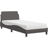Postelja z vzmetnico siva 90x190 cm umetno usnjeS to posteljo z vzmetnico si zagotovite bolj miren spanec! Je prijeten dodatek za vsako spalnico. Trpežno umetno usnje: Vrhunsko umetno usnje je zelo vzdržljiv material. Je odporno na madeže, zato ga lahko preprosto čistite z vlažno krpo. Gladka površina mu prav tako daje razkošen videz in lepoto pravega usnja.Letvice iz vezanega lesa: Letvice iz vezanega lesa omogočajo dobro porazdelitev teže in zagotavljajo, da vzmetnica ostane na mestu ob vsakem zasuku in obračanju med spanjem.Udobna opora: To vzglavje za posteljo vam zagotavlja odlično oporo za hrbet, ko sedite na postelji in berete ali gledate filme.Vzmetnica iz pene: Za optimalno udobje je ta triplastna vzmetnica iz tkanine napolnjena z 22D PU peno. Pomaga lajšati utrujenost in spodbuja krvni obtok ter zagotavlja popolno sprostitev in kakovosten spanec. Poleg tega je vzmetnica na voljo v trdotah H2 in H3, tako da jo lahko preprosto obrnete in izberete trdoto, ki vam najbolj ustreza.Valovita stranica: Valoviti videz posteljnega okvirja je eleganten in prefinjen. Dekorju v vašem domu dodaja sodoben in eleganten pridih ter tako postane osrednja točka spalnice.Deine VorteileS to posteljo z vzmetnico si zagotovite bolj miren spanec! Je prijeten dodatek za vsako spalnico.Druge specifikacijePosteljni okvir:Barva: SivaMaterial: Umetno usnje (75 % polivinilklorid, 5 % bombaž, 20 % poliester), kovina, trdna borovina, vezan les, inženirski lesCelotne dimenzije: 208 x 95 x 74,5 cm (D x Š x V)Vzmetnica iz pene:Barva: Bela Material prevleke: Pletenina Material polnila: 22D PU pena Trdota: H2 in H3 Celotne dimenzije: 90 x 190 x 17 cm (Š x D x D)Potrebno sestavljanje: DaPaket
