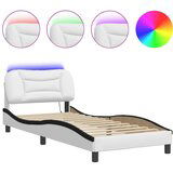 Posteljni okvir z LED lučkami bel in črn 90x190 cm umetno usnjeZagotovite si boljši spanec s tem posteljnim okvirjem z LED lučkami! Je prijeten dodatek za vsako spalnico. Trpežno umetno usnje: Vrhunsko umetno usnje je zelo vzdržljiv material. Je odporno na madeže, zato ga lahko preprosto čistite z vlažno krpo. Gladka površina mu prav tako daje razkošen videz in lepoto pravega usnja.Letvice iz vezanega lesa: Letvice iz vezanega lesa omogočajo dobro porazdelitev teže in zagotavljajo, da vzmetnica ostane na mestu ob vsakem zasuku in obračanju med spanjem.Udobna opora: To vzglavje za posteljo vam zagotavlja odlično oporo za hrbet, ko sedite na postelji in berete ali gledate filme.Barvit LED trak: Vnesite igrivost v temo z barvitimi LED lučkami! Kljuke in zanke na hrbtni strani vzglavja lahko uporabite za pritrditev LED lučk.Valovita stranica: Valoviti videz posteljnega okvirja je eleganten in prefinjen. Dekorju v vašem domu dodaja sodoben in eleganten pridih ter tako postane osrednja točka spalnice. Dobro je vedeti:Vzmetnica ni priložena tej postelji. Ponujamo različno izbiro ležišč. V naši trgovini si lahko ogledate ustrezne vzmetnice.Izdelek ima priključek USB, ki zahteva certificiran vir napajanja 5 V USB (ni priložen).Deine VorteileZagotovite si boljši spanec s tem posteljnim okvirjem z LED lučkami! Je prijeten dodatek za vsako spalnico.Druge specifikacijePosteljni okvir:Barva: Bela in črnaMaterial: Umetno usnje (75 % polivinilklorid, 5 % bombaž, 20 % poliester), kovina, trdna borovina, vezan les, inženirski lesCelotne dimenzije: 208 x 95 x 74,5 cm (D x Š x V)Velikost primerne vzmetnice: 90 x 190 cm (Š x D) (vzmetnica ni priložena)Potrebno sestavljanje: DaOblazinjeno