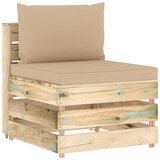 Sekcijski sredinski kavč z blazinami zelen impregniran lesTa lesen sredinski kavč je idealna izbira za sproščanje in uživanje v lepem vremenu, za počitek ali pogovor z vašo družino ali prijatelji. Lesen kavč ima brezčasno obliko iz palet, vaši terasi, vrtu ali dnevni sobi pa bo dodal pridih rustikalnega čara. Srednji sedež je izdelan iz impregniranega borovega lesa, zaradi česar je trpežen in odporen na vremenske vplive. Ta srednji stol ima trdno konstrukcijo in ne potrebuje veliko vzdrževanja. Kavč iz palet je zasnovan posebej za uporabo kot del sedežne garniture, lahko pa se uporablja tudi kot samostojni kavč. Kombinirate ga lahko z drugimi modularnimi segmenti v spletni trgovini, kot so klubska mizica, naslon za noge in srednji kavč, ter tako ustvarite vrtno sedežno garnituro po lastnih željah! Opomba: Da bi podaljšali življenjsko dobo vašega zunanjega pohištva, vam priporočamo, da ga zaščitite z vodoodporno prevleko.Deine VorteileSprostite se in uživajte v zunanjih prostorih s tem lesenim sredinskim kavčem! V kombinaciji z drugimi sedeži nudi neskončno možnosti za postavitev, da se prilega vašim potrebam in prostoru.Druge specifikacijeBarva blazine: BežMaterial: Borovina, zelena impregniranaMaterial blazine: Tkanina (100 % poliester)Dimenzije sredinskega kavča: 60 x 70 x 66 cm (Š x G x V)Debelina blazine za sedež: 6 cmDebelina hrbtne/stranske blazine: 13 cmPotrebno sestavljanje: DaPaket vsebuje:1 x Sredinski kavč1 x Blazina za sedež1 x Blazina za hrbetVsebina paketaSekcijski sredinski kavč z blazinami zelen impregniran les (1x)Gut to clearIhre Naročilo prejmete v 2 paketih. Upoštevajte, da so tukaj vsebovani podatki pakirani v skladu z vašimi željami. V nekaterih primerih