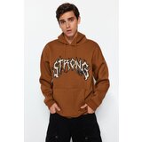 Trendyol Light Brown Men's Oversize/Wide-Cut Fleece Inner Hoodie with Text Embroidered Sweatshirt. cene