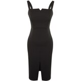 tesno prilegajoč se kroj širše naramnice zapenjanje z zadrgo razporek na krilu