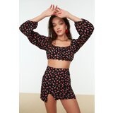 Ženski komplet Crop top: dolgi rokav zapenjanje z gumbi kvadratni izrez Krilo: visok pas razporek na sprednji strani zadrga  Mere modela: višina: 181 prsni koš: 89 pas: 70 boki: 98 Velikost izdelka na modelu: S / 36 Material : 100% viskoza