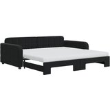 Ta 2 v 1 izvlečna dnevna postelja, ki služi kot kavč in postelja, je praktičen in privlačen dodatek za vašo dnevno sobo ali spalnico. Vsestranska dnevna postelja: Raztegljiva postelja čez dan deluje kot kavč, ponoči pa se z izvlečenim ležiščem zlahka spremeni v zakonsko posteljo, kar je priročna rešitev za sprejemanje gostov in maksimalno povečanje prostora.Udobna penasta vzmetnica: Ta postelja je opremljena z dvema vzmetnicama iz pene za največjo podporo in optimalno udobje.Mehak žamet in trdna konstrukcija: Ta dnevna postelja ima trpežen okvir iz lesa in kovine ter je oblazinjena z mehkim in udobnim žametom.Barva: ČrnaMaterial: Žamet (100% poliester), kovina, trden lesMaterial letvic: Vezan lesMaterial prevleke vzmetnice: Kosmatena pleteninaMaterial polnila: PenaDimenzije (neraztegnjena): 223 x 110 x 71 cm (D x Š x V)Dimenzije (raztegnjena): 223 x 212,5 x 71 cm (D x Š x V)Dimenzije vzmetnice iz pene (vsaka): 100 x 200 x 10 cm (Š x D x V)Višina naslonjala za roke, merjena od tal: 58 cmVišina nog: 5 cmPotrebno sestavljanje: DaPaket vsebuje:1 x Izvlečna dnevna postelja2 x Vzmetnica iz pene
