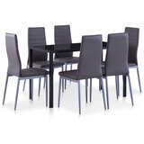 Ta 7delna jedilna garnitura se ponaša z elegantno in moderno obliko. Popolna je za tiste, ki želijo v svoje notranje prostore vnesti pridih stila. Površina mize je narejena iz izjemno močnega kaljenega stekla, ki omogoča enostavno čiščenje. Vsak stol je oblečen v visokokakovostno umetno usnje. Mehki, podloženi sedeži so zelo udobni. Paket vsebuje 1 mizo in 6 stolov. Barva: Siva Material mize: Kaljeno steklo + jeklen okvir Material stola: Umetno usnje + lesen okvir + železne noge Dimenzije mize: 120 x 60 x 74 cm (D x Š x V) Dimenzije stola: 43 x 50 x 96 cm (Š x G x V) Velikost sedeža: 43 x 39 cm (Š x G) Višina sedeža, merjena od tal: 46 cm Paket vsebuje 1 mizo in 6 stolov Tkanina: Bombaž: 5%, PVC: 95%
