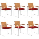 Ti leseni stoli, ki se lahko zložijo eden na drugega, so zasnovani tako, da bodo postali ključna točka vašega vrta ali terase. Jedilni stoli so izdelani iz trdnega akacijevega lesa in visokokakovostnega nerjavnega jekla, zato so zelo trpežni, odporni proti rji, robustni in enostavni za čiščenje z vlažno krpo. Priložena blazina je več kot le praktičen dodatek; ima tudi dekorativno funkcijo. Sedite in si privoščite prijetno večerjo na prostem ali sproščanje ter uživanje v lepem vremenu z našim klasičnim kompletom vrtnih stolov! Opomba: Da bi podaljšali življenjsko dobo vašega zunanjega pohištva, vam priporočamo, da ga zaščitite z vodoodporno prevleko. Barva blazine: Rdeča Material: Trden akacijev les z oljnim premazom in videzom tikovine, nerjaveče jeklo 304 Material blazine: Tkanina (100 % poliester) Dimenzije: 60 x 56 x 85 cm (Š x G x V) Globina sedeža: 46 cm Višina sedeža: 45 cm Višina naslonjala za roke, merjena od tal: 65,5 cm Debelina blazine: 7 cm Lahko se shranijo eden na drugega Odporno na vremenske vplive in rjavenje Potrebno sestavljanje: Da Paket vsebuje: 6 x Stol 6 x Blazina