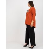 Brick red plus size blouse with appliqus. Product code: RVBZ8378.70Dominant pattern: plainStyle: Casualoccasion: everyday, for work, for a walk, for the city The model is wearing one size. Model's measurements: height 174 cm, bust 100 cm, waist 74 cm, hips 107 cm. Measurements of the blouse in one size measured flat: armpit width 62 cm, sleeve length 50 cm, total length 79 cm.