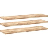 Viseče police 3 kosi 120x40x4 cm neobdelan trden akacijev lesS temi lesenimi visečimi policami spremenite golo steno v oblikovalski poudarek in praktično, prostorsko učinkovito shrambo v svojem bivalnem prostoru! Robusten in stabilen material: Trden akacijev les je znan po svoji trdnosti in trajnosti. Različne barve in edinstveni vzorci zrn mu dajejo privlačen videz. Zaradi odlične stabilnosti in odpornosti na vremenske vplive je idealen za izdelavo notranjega in zunanjega pohištva.Neobdelana površina: Ta polica je izdelana iz neobdelanega akacijevega lesa, zato lahko ohranite njeno naravno barvo ali jo po želji prilagodite z barvo ali lakom.Sam svoj mojster: Lahko jih razporedite po naključnem vzorcu, na primer z desne na levo, od zgoraj navzdol ali v obliki lestve. Z več stenskimi policami lahko ustvarite edinstvene in prilagojene vzorce.Varčevanje s prostorom: Ta viseča polica maksimalno izkoristi neuporabljen prostor na steni in ga spremeni v kompakten in učinkovit prostor za shranjevanje.Široka uporaba: Ta vsestranska stenska polica se lahko uporablja v različnih prostorih, kot so kuhinja, kopalnica, dnevna soba, spalnica, študijska soba, garaža itd. Dobro je vedeti:Vsak izdelek je edinstven, saj se med seboj razlikujejo po barvah in zrnatosti. Dostava je naključna, kar zagotavlja ekskluzivnost in individualnost vašega izdelka.Dobava vključuje samo stenske police. Vijaki in nosilci niso vključeni v dobavo.Deine VorteileS temi lesenimi visečimi policami spremenite golo steno v oblikovalski poudarek in praktično, prostorsko učinkovito shrambo v svojem bivalnem prostoru!Druge specifikacijeMaterial: Trden akacijev les (neobdelan) Dimenzije: 120 x 40 x 4 cm (D x Š x D)Oblika: PravokotnaPaket vsebuje:3 x Viseča