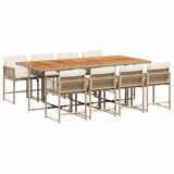 Vrtna jedilna garnitura 9delna z blazinami bež poli ratanTa vrtna jedilna garnitura je odlična izbira za večerjo na prostem ali za sprostitev na vrtu, dvorišču ali terasi. Vzdržljiv material: PE ratan, znan tudi kot poli ratan, je močan sintetični material, ki zahteva malo vzdrževanja in je videti kot naravni ratan. Je lahek, enostaven za čiščenje in se zaradi svoje vzdržljivosti in odpornosti na vremenske vplive pogosto uporablja za zunanje pohištvo.Kompaktno shranjevanje: Te stole je mogoče zložiti, zato jih je enostavno shraniti pod mizo. Ko so zloženi, se lepo prilegajo pod mizo in tvorijo prostorsko varčno kocko.Udobno sedenje: To zunanje pohištvo z debelo oblazinjenimi blazinami zagotavlja udobno sedenje.Prevleko je mogoče odstraniti in oprati: Te sedežne blazine imajo odstranljive prevleke za lažje pranje in vzdrževanje. Prevleke za blazine imajo na zadnji strani zavihek za enostavno pritrditev na naslonjala.Stabilna mizna plošča, ki je enostavna za čiščenje: Ta vrtna miza ima ploščo iz akacijevega lesa, ki je čvrsta, vzdržljiva in jo je enostavno čistiti z vlažno krpo. Dobro je vedeti:Če želite, da vaše zunanje pohištvo ostane lepo, vam priporočamo, da ga zaščitite z vodoodporno prevleko.Deine VorteileTa vrtna jedilna garnitura je odlična izbira za večerjo na prostem ali za sprostitev na vrtu, dvorišču ali terasi.Druge specifikacijeMaksimalna nosilnost (na sedež): 110 kgUVodpornoPotrebno sestavljanje: DaMiza:Barva mize: Bež in rjavaMaterial: PE ratan, jeklo s prašnim premazom, trden akacijev lesDimenzije: 220 x 106 x 73 cm (D x Š x V)Stol:Barva: BežMaterial: PE ratan, jeklen okvir s prašnim premazomDimenzije: 50,5 x 50 x 79 cm (Š x G x